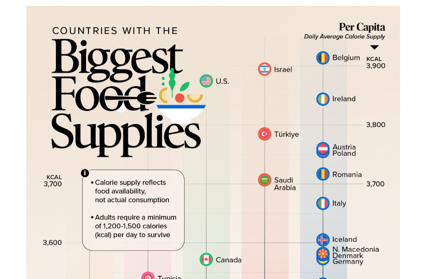 Belgia se află pe primul loc la calorii per persoană, cu o ofertă alimentară de 3.914 calorii per capita pe zi, urmată de Israel (3.895 kcal) și Statele Unite (3.875 kcal). Aceste valori măsoară oferta totală de hrană și nu iau în calcul distribuția sau risipa la nivel de farfurie.
