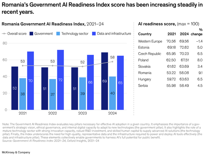 Click aici pentru vizualiza articolul integral articolul - "Analiză McKinsey: Inteligenţa artificială generativă ar putea automatiza până la 60% din munca din administraţia publică din România. Statul ar putea câştiga un miliard de euro pe an".