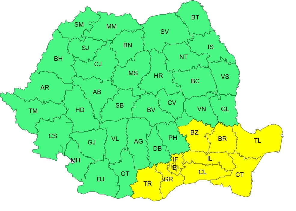 Administrația Națională de Meteorologie (ANM) a emis, sâmbătă, o atenționare meteo Cod galben de vânt puternic ce vizează județele din sud-estul țării, valabilă pe parcursul zilei.