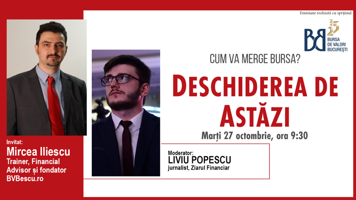 Click aici pentru vizualiza articolul integral articolul - "DESCHIDEREA DE ASTĂZI. Cum va merge bursa. Urmăriţi o discuţie marţi, 27 octombrie ora 09.30 cu Mircea Iliescu, Trainer, Financial Advisor si Fondator BVBescu.ro".