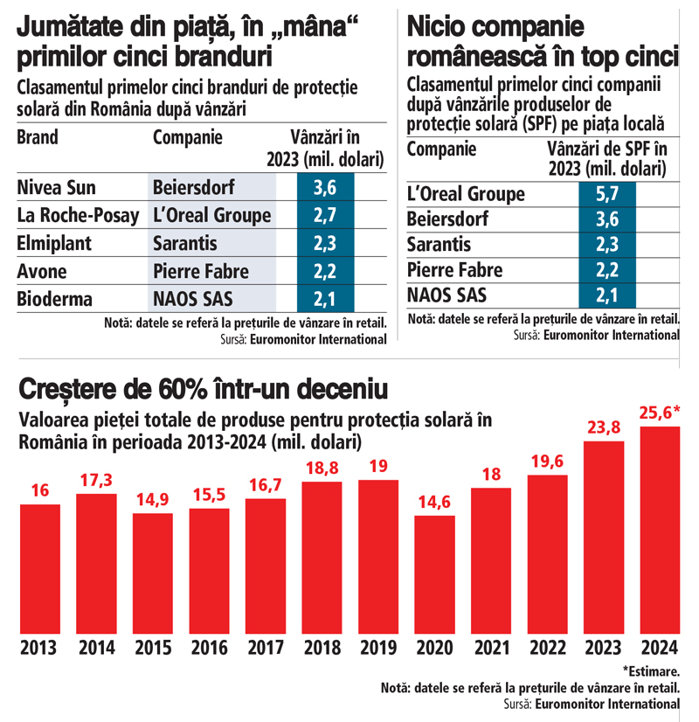 Într-un deceniu, vânzările la produsele de protecţie solară au crescut cu 50%, până la aproape 24 mil. dolari (108 mil. lei) în 2023, arată datele transmise de compania de cercetare de piaţă Euromonitor.