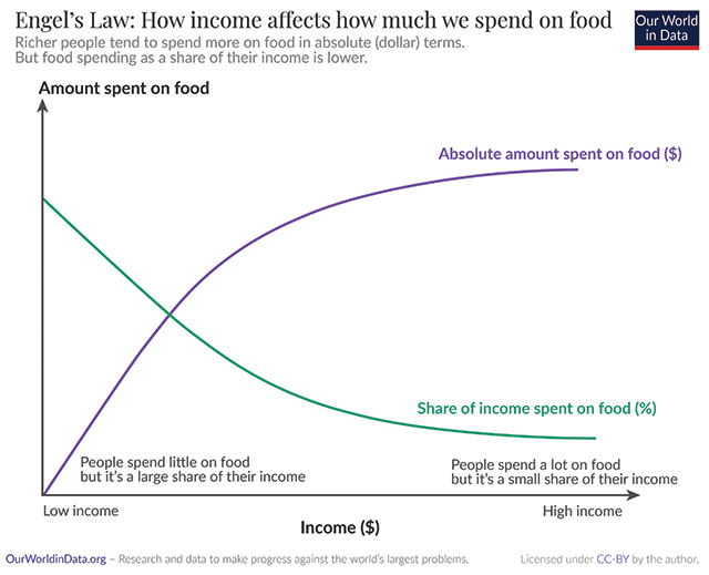 Pe măsură ce veniturile cresc, ponderea cheltuielilor pentru alimente în bugetul total scade, chiar dacă valoarea absolută a acestor cheltuieli poate creşte. În ţările dezvoltate, unde cheltuielile totale de consum depăşesc 10.000 de dolari pe persoană pe an, suma alocată pentru alimente este de peste 2.000 de dolari anual.